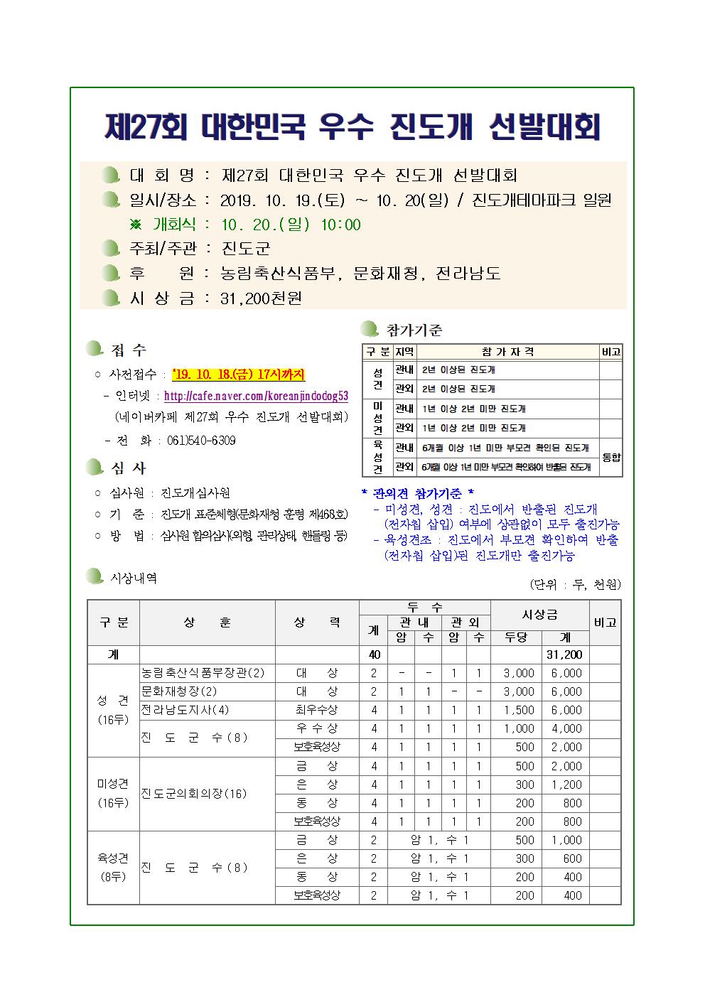 가. 대회명 : 제27회 대한민국 우수 진도개 선발대회