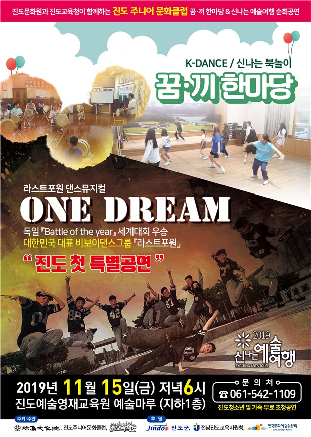 진도 청소년들의 꿈과 끼를 발굴해온 진도주니어문화클럽의 방과 후 교실 프로그램의 성과발표인 ·끼 한마당과 한국문화예술위원회 공모선정 프로그램 신나는 예술여행의 순회공연을 한 자리에서 만날 수 있습니다. 청소년들과 가족이 함께 하는 축제의 장에 초대합니다.