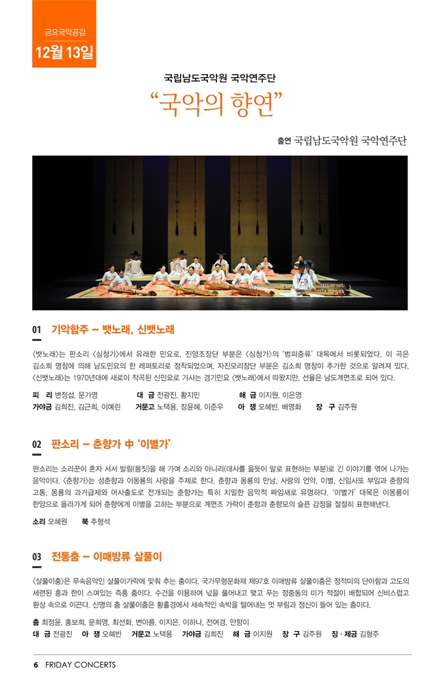 12월 13일 금요국악공감은 국립남도국악원 국악연주단의 "국악의 향연" 입니다.
