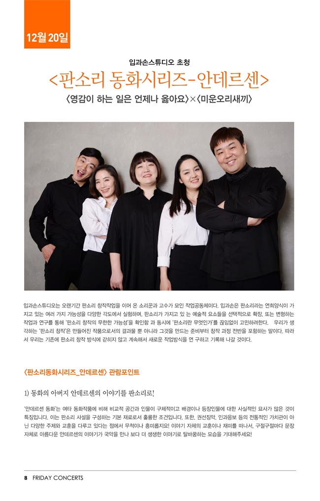 국립남도국악원 12월 20일 금요국악공감은 입과손스튜디오초청 "판소리 동화시리즈-안데르센" 입니다.