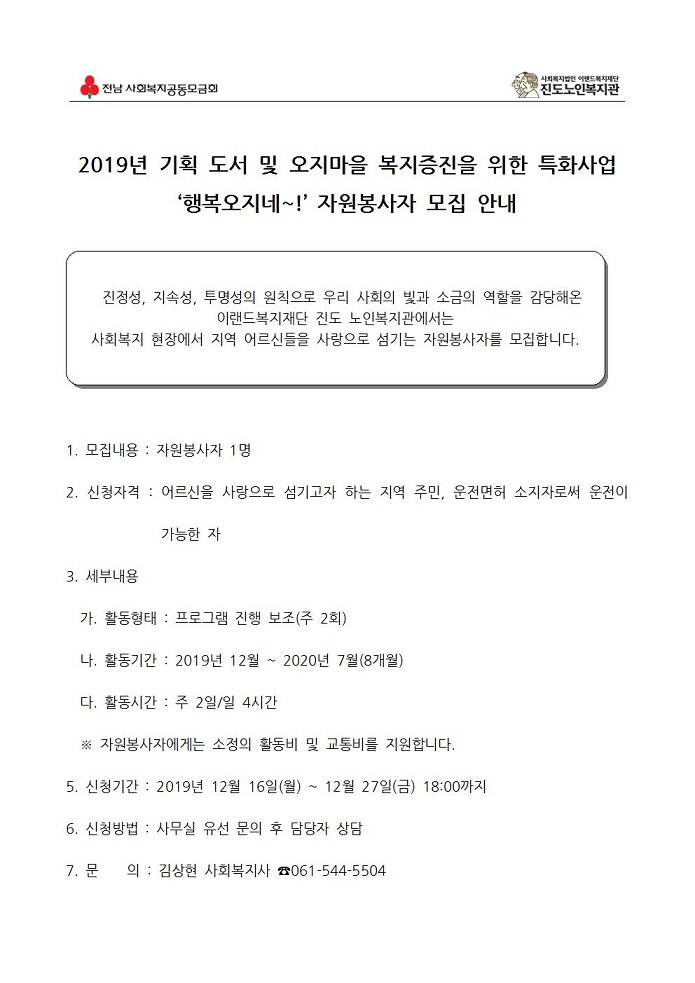 진도노인복지관 2019년 기획 도서 및 오지마을 복지증진을 위한 특화사업 유급봉사자 모집 안내