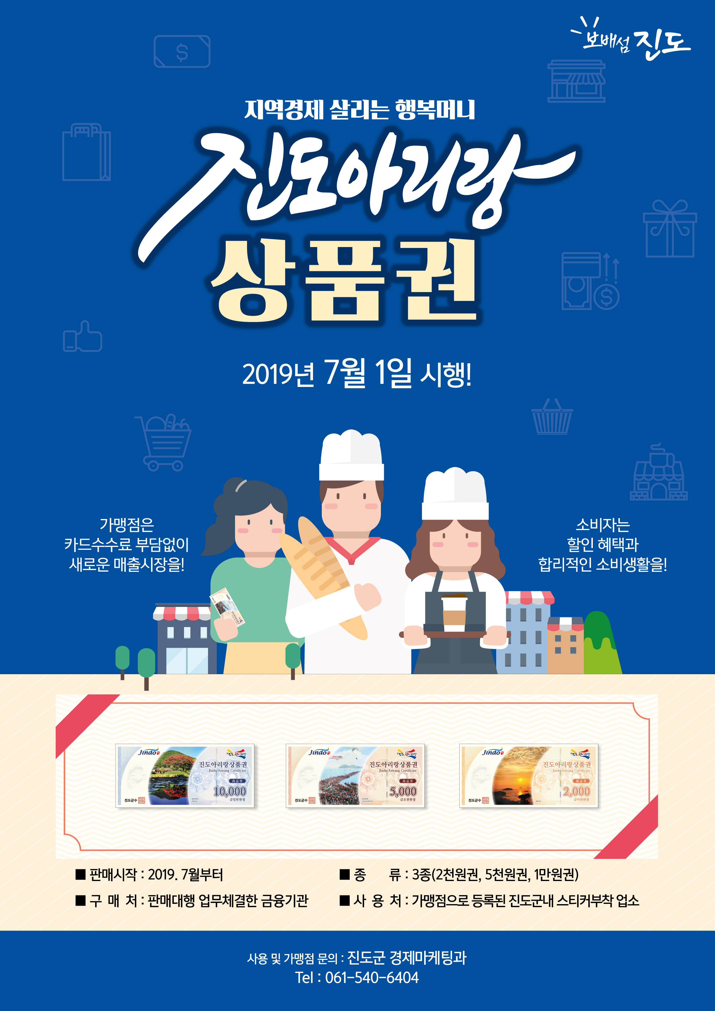 | 「진도아리랑상품권」설명절 할인 판매 안내 ․ 기 간 : ‘20. 01. 06(월) ∼ 01. 31.(금) ․ 종 류 : 2천원 / 5천원 / 1만원권 ․ 구 입 처 : 관내 금융기관 17개 지점(현금 또는 계좌이체로만 구매가능) ․ 할 인 율 : 10% 할인( 법인․단체는 할인불가, 평상시 할인율 5%) ․ 사 용 처 : 관내 진도아리랑상품권 가맹점 ․ 문 의 처 : ☎ 061) 540–6406 (경제마케팅과 김채환) |