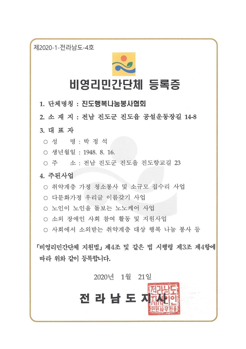 진도행복나눔봉사협회-비영리민간단체 등록