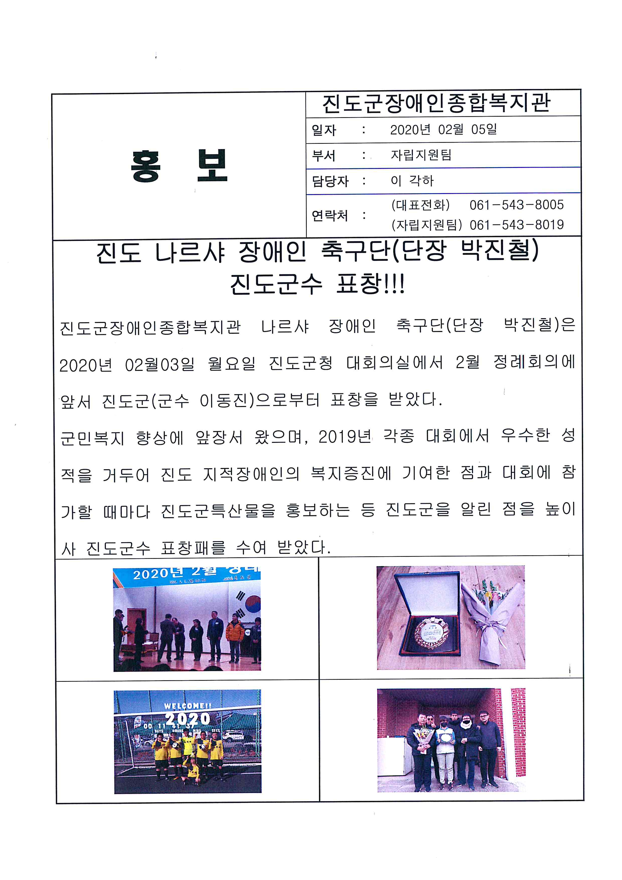진도군 '나르샤 장애인 축구단' 진도군수 표창!!