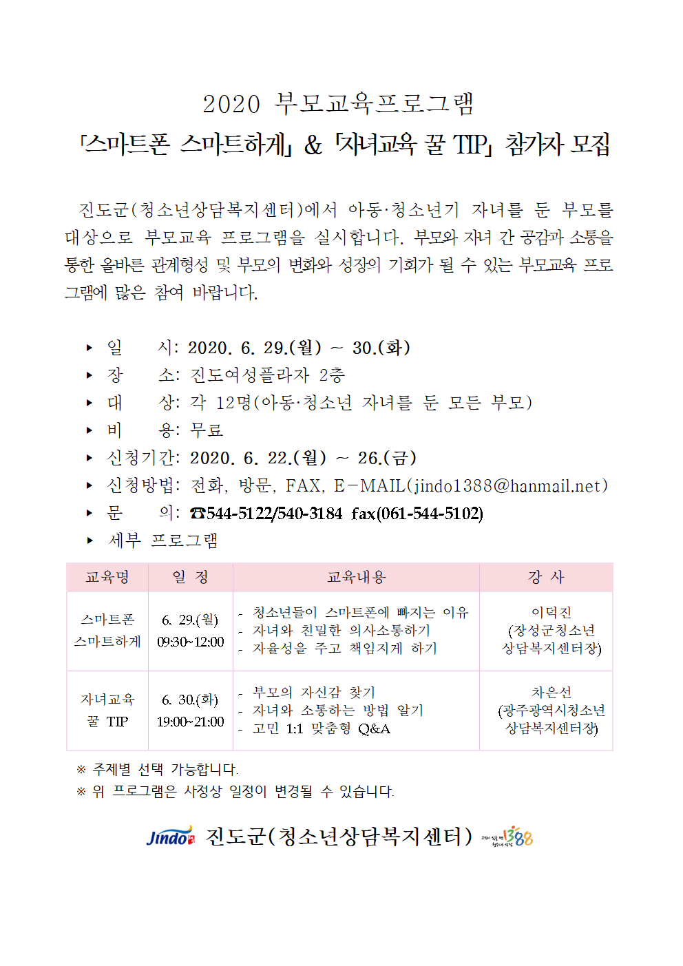 2020 부모교육프로그램「스마트폰 스마트하게」&「자녀교육 꿀 TIP」참가자 모집