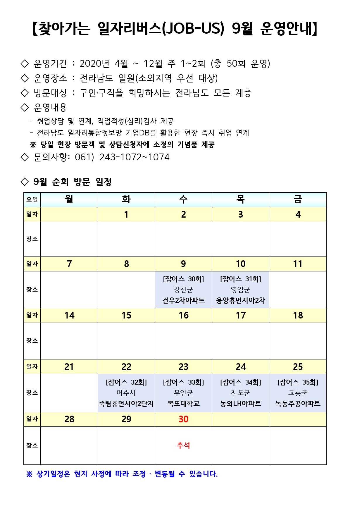 LH와 전라남도가 함께하는 일자리 꿈터에서는 시간적·공간적 제약으로 일자리를 찾기 어려운 구직자 및 지역주민을 위해 고용서비스 전문 컨설턴트가 현장에서 취업상담을 제공하는 찾아가는 일자리버스를 운영하고 있습니다. 일시: 9월 24일(월) 10:30 ~ 17:00 장소: 진도군 동외LH아파트 단지 내 문의: 061-243-1072~1074
