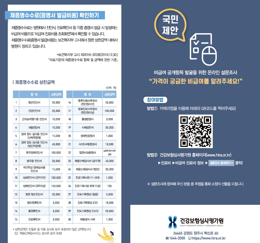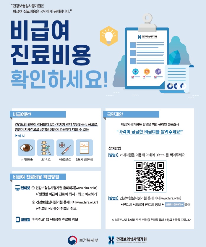 건강보험심사평가원에서는 국민의 알 권리보장과 의료선택권 강화를 위해 의료기관의 비급여 진료비용 등을 매년 조사하여 홈페이지(www.hira.or.kr)과 모바일 앱(건강정보)를 통해 공개하고 있습니다. 비급여 진료비용 공개제도 홍보 포스터와 함께 안내드리니, 병원을 선택할 때 참고하시기 바랍니다. (건강보험심사평가원 ☎1644-2000)
