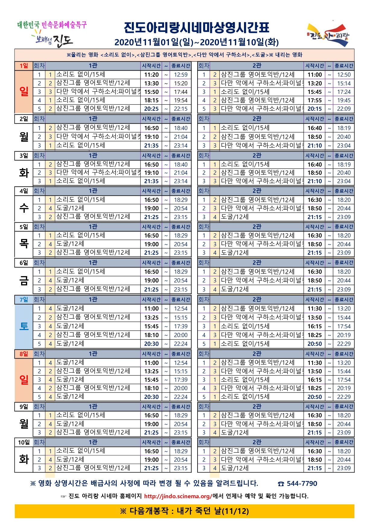 진도 아리랑시네마 상영스케줄 20.11.01 ~ 20.11.10