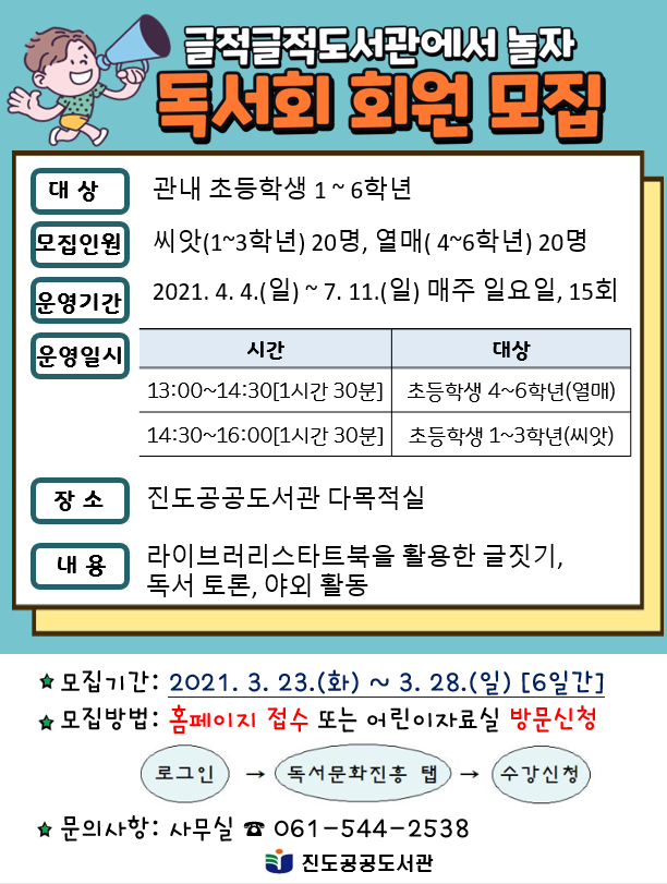 진도공공도서관 '글적글적도서관에서 놀자' 어린이 독서회 회원 모집