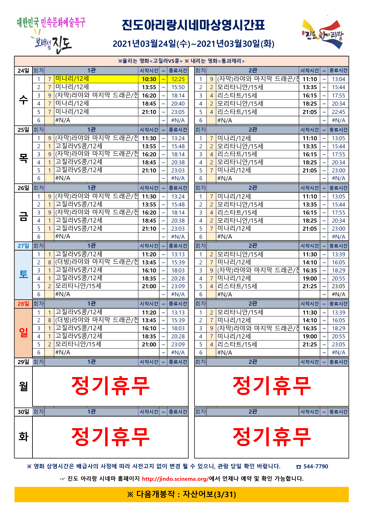 진도아리랑시네마 상영시간(2021.03.24~.3.30) 안내드립니다.
