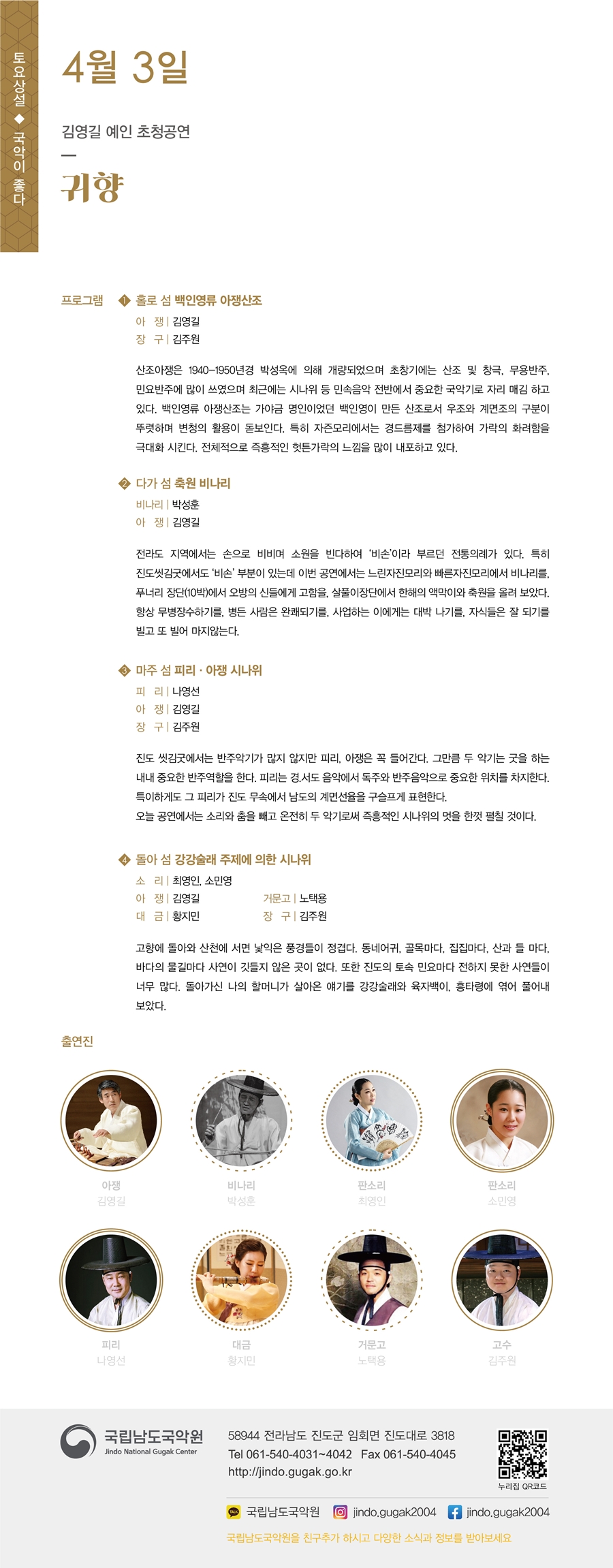 ‘귀향’이라는 주제로 진도 출신 김영길 예인의 아쟁산조와 피리, 거문고 등 다양한 악기, 소리와 함께 어우러지는 공연, 한 자리에서 만나보세요~