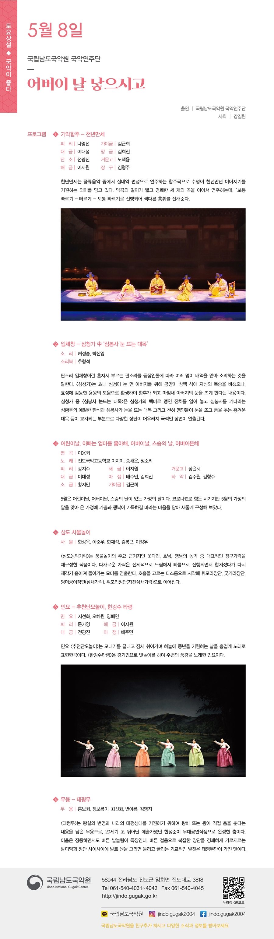 이번 주 토요상설 “국악이 좋다!” 공연은 국립남도국악원 국악연주단 “어버이 날 낳으시고”!!