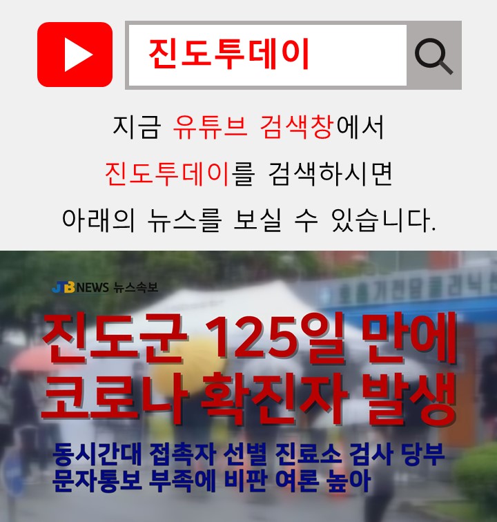 <속보> 진도군 125일 만에 코로나 확진자 발생 ☞ 유튜브에 진도투데이를 검색하시면 해당 영상확인 가능합니다.