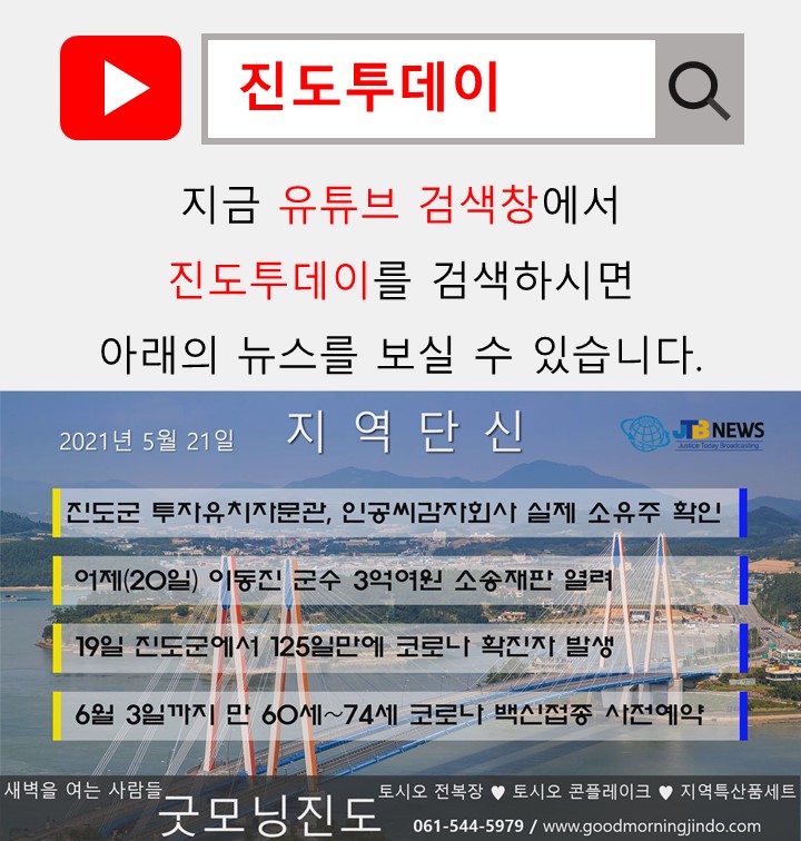 ★이동진 군수 3억여원 소송재판★에 관한 소식을 5월 21일 지역단신에서 확인하세요!!!! ☞지금 유튜브에 진도투데이를 검색하시면 확인가능합니다 ☜
