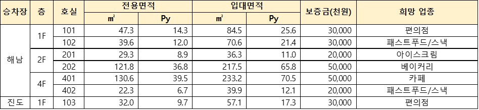 1) 임대방식 : 상가보증금 + 월 수수료 방식 운영