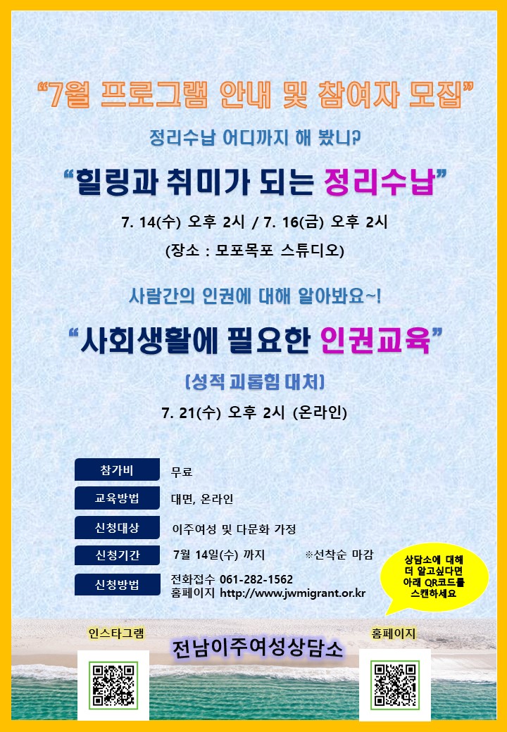 전남폭력피해이주여성상담소 7월 프로그램 안내 및 참여자 모집