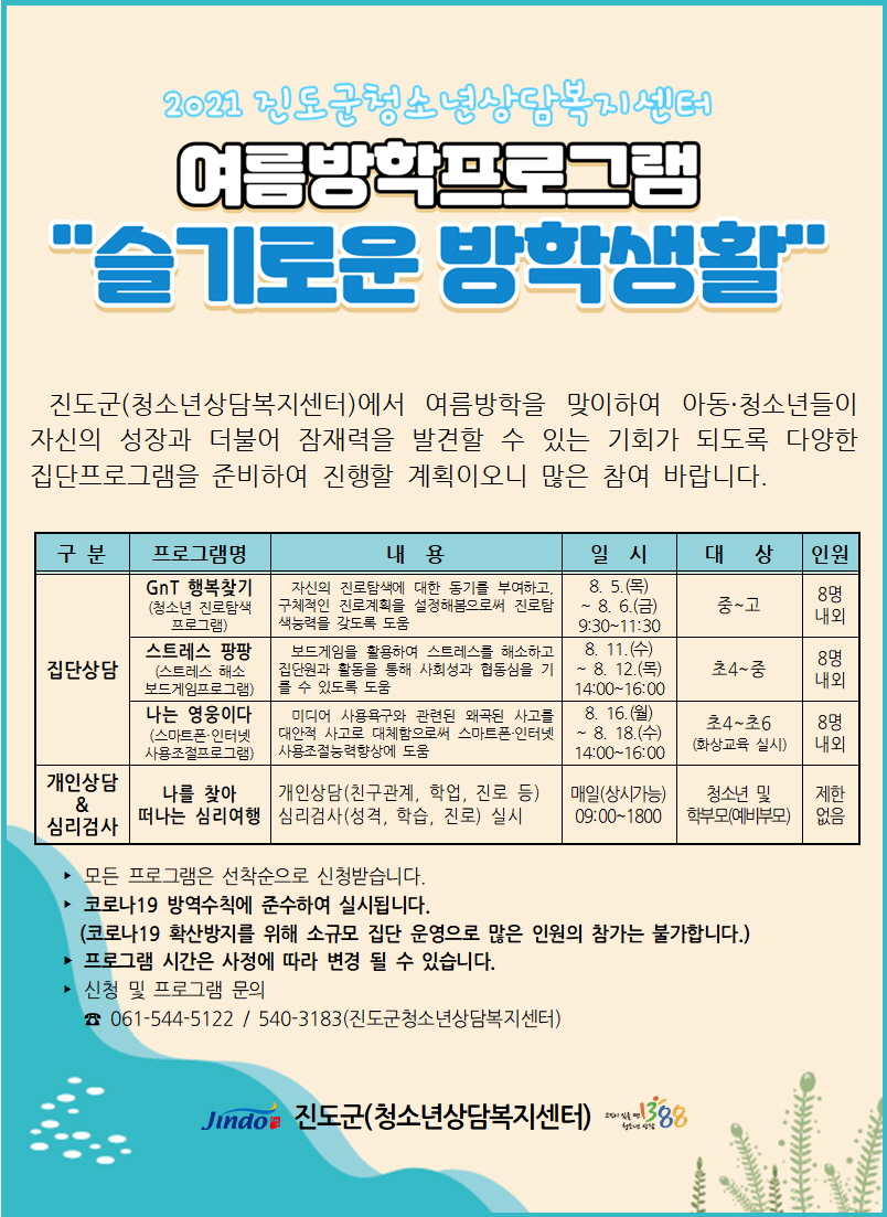 2021년 청소년상담복지센터 여름방학프로그램 "슬기로운 방학생활" 참가자 모집 안내