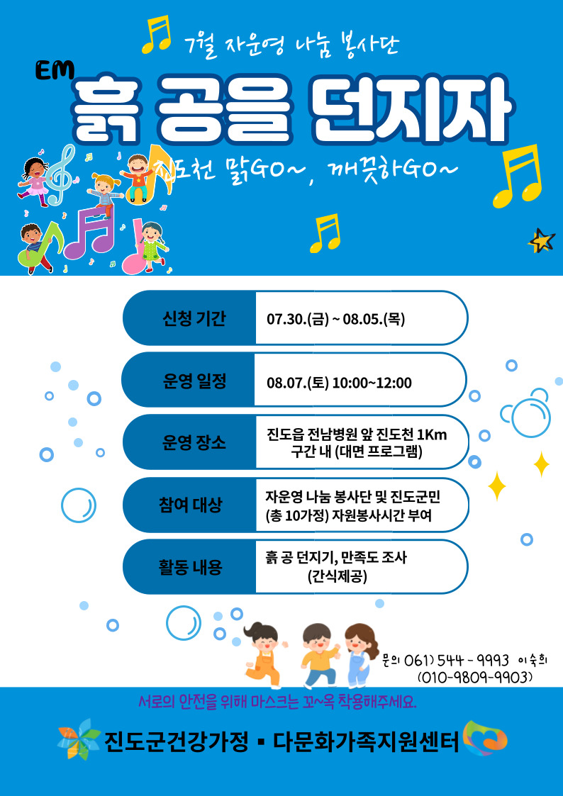 ♣가족센터♣ 7월 자운영나눔봉사단 프로그램(EM 흙공을 던지자 - 진도천 맑GO~, 깨끗하GO~) 참여자 모집