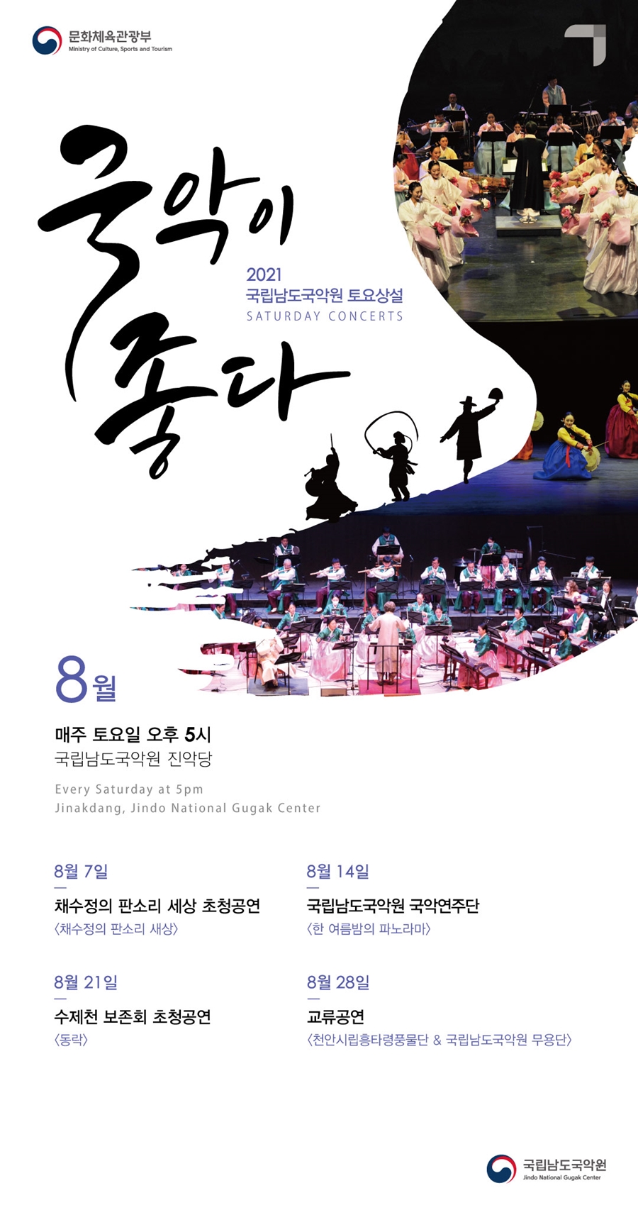 단가, 판소리 및 수제천, 국악관현악 등 다양한 공연들로 8월 토요상설 ‘국악이 좋다!’의 문을 엽니다. 많은 관심 부탁드립니다~