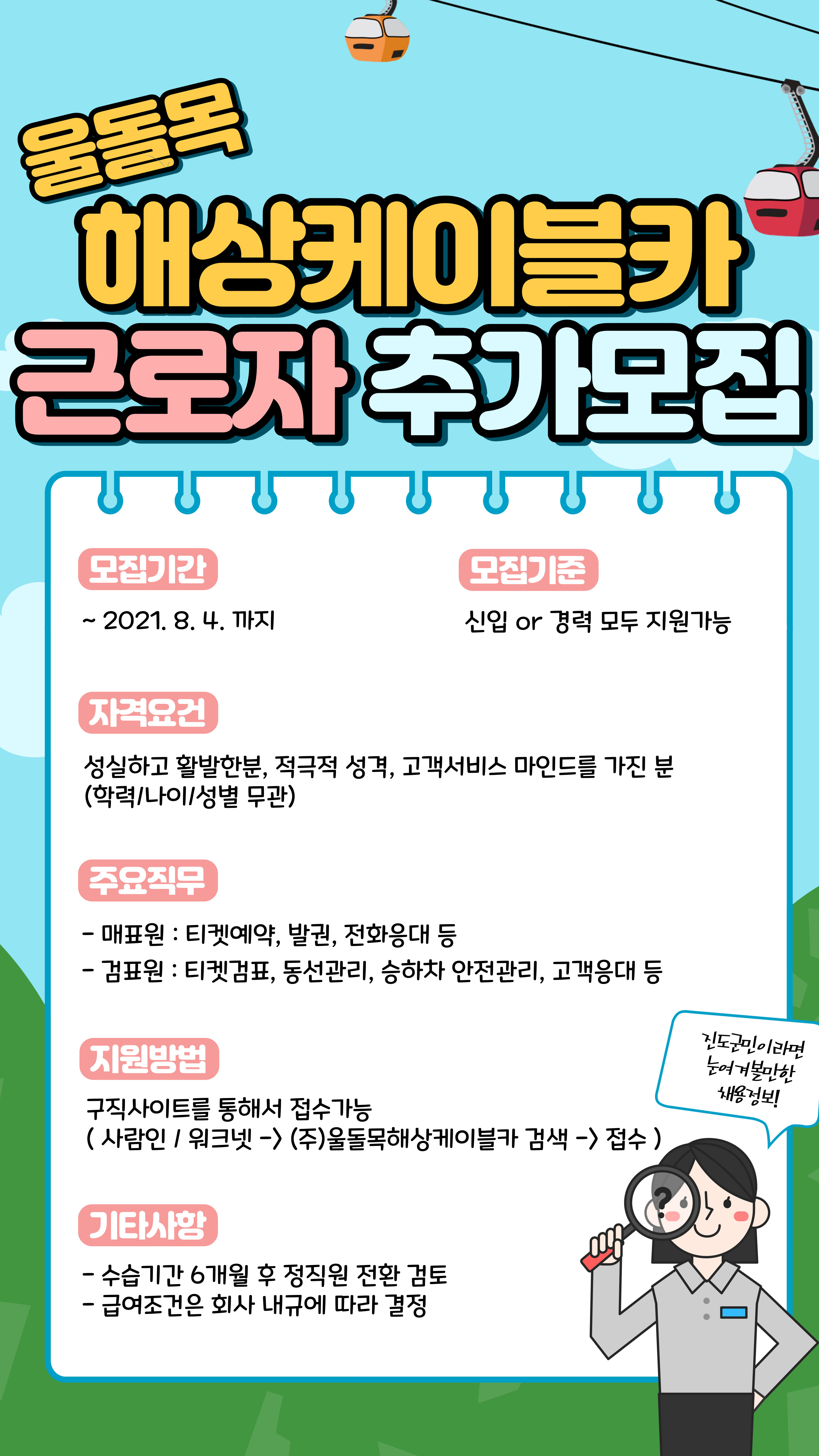 [명량해상케이블카] 매표/검표 인력 채용 공고를 8월 4일까지 추가 모집합니다~ 진도 청년분들의 많은 지원 부탁드립니다.