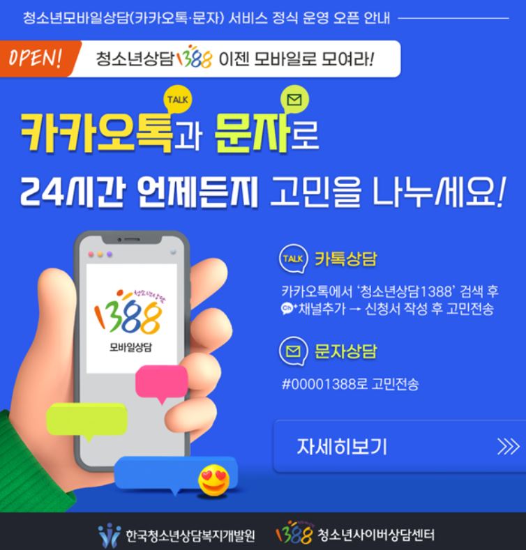 ■청소년상담복지센터■ 카카오톡과 문자로 24시간 고민 나눔 가능!