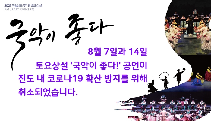 토요상설 ‘국악이 좋다!’ 취소 안내 국립남도국악원 8월 7일과 14일 토요상설 ‘국악이 좋다!’ 공연이 진도 내 코로나19 확산 방지를 위해 취소되었음을 알려드립니다. 추후 공연 일정이 변경될 경우, 누리집에 재 공지 하도록 하겠습니다. 많은 양해 부탁드립니다. ☎ 공연문의 061-540-4036