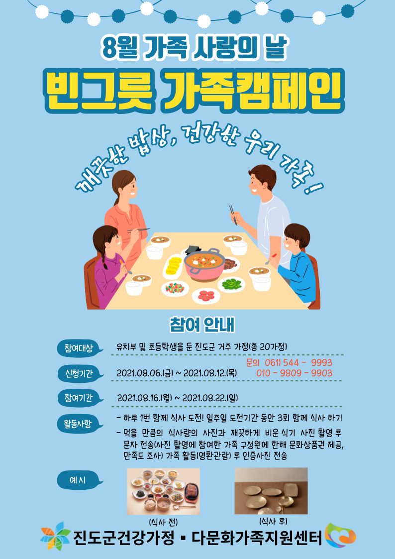 ♣가족센터♣ 8월 가족사랑의 날 프로그램(빈그릇 가족 캠페인 - 깨끗한 밥상, 건강한 우리 가족!) 참여자 모집