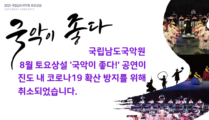8월 토요상설 ‘국악이 좋다!’ 취소 안내 국립남도국악원 8월 토요상설 ‘국악이 좋다!’ 공연이 진도 내 코로나19 확산 방지를 위해 취소되었음을 알려드립니다. 많은 양해 부탁드립니다. ☎ 공연문의 061-540-4036