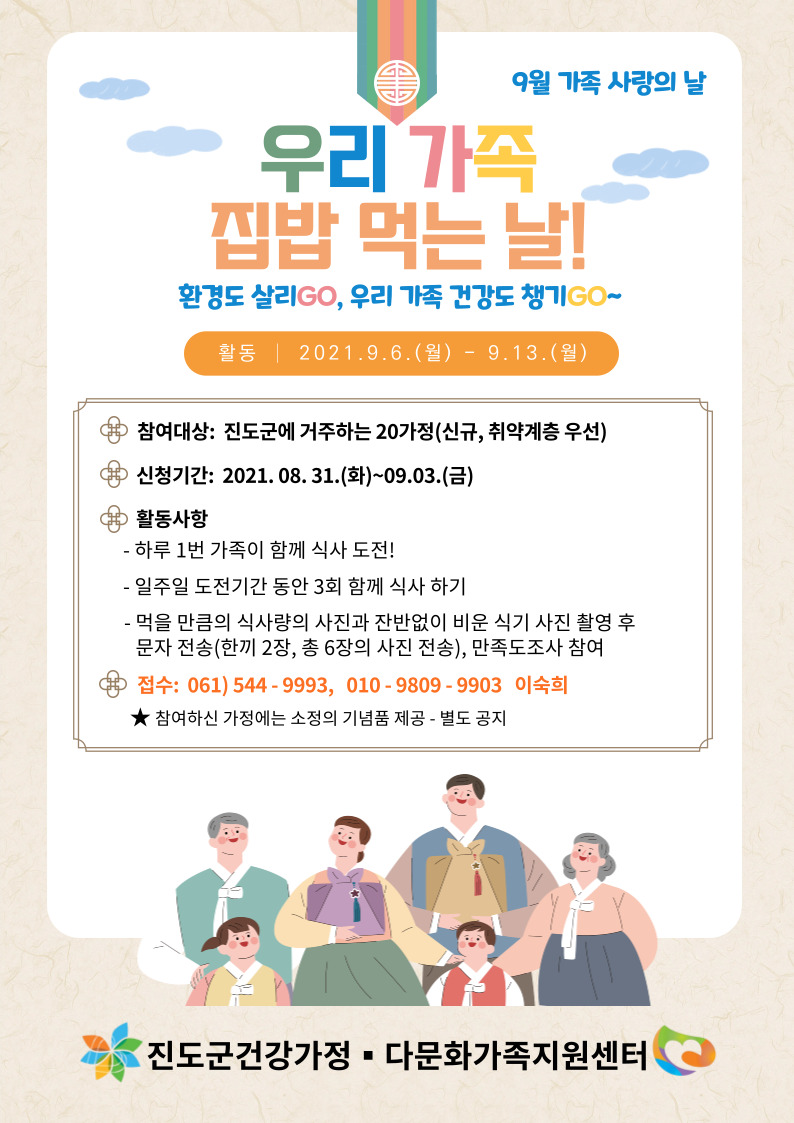 ♣가족센터♣ 9월 가족사랑의 날 프로그램(빈그릇 가족 캠페인 2차- 우리 가족 집 밥 먹는 날!) 참여자 모집