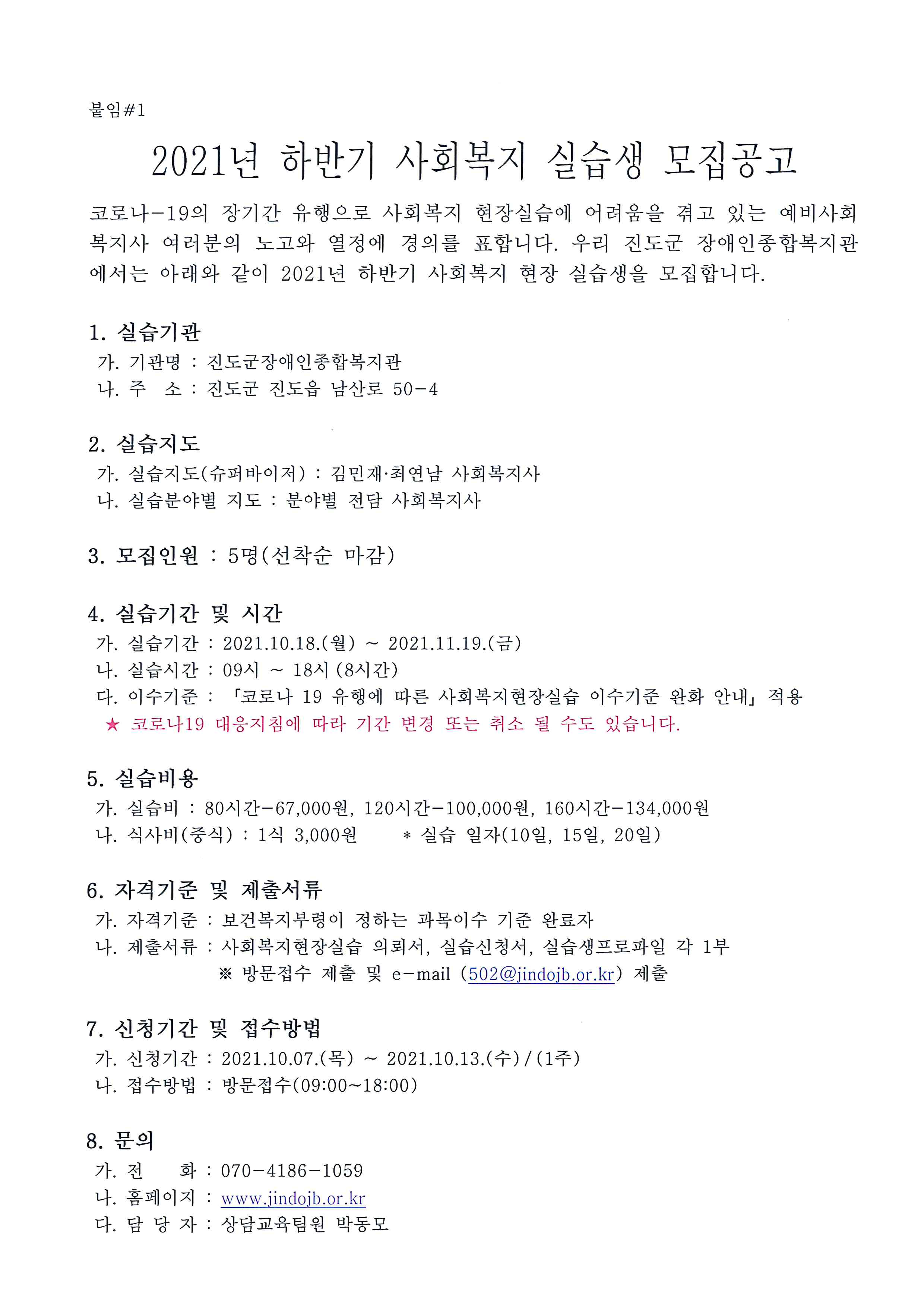 진도군장애인종합복지관 하반기 사회복지 실습생 모집