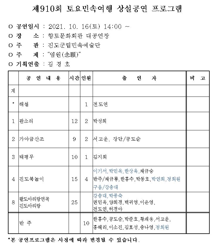 제910회 진도토요민속여행 상설공연이 펼쳐집니다.