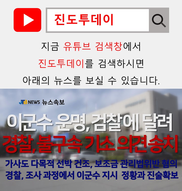 [속보][JTB NEWS /진도투데이] 이군수 운명, 검찰 손에 놓여 경찰, 불구속 기소 의견 송치 가사도 다목적 선박 건조, 보조금 관리법 위반 혐의 경찰, 조사 과정에서 이군수 지시 정황과 진술 확보 ===========================================================