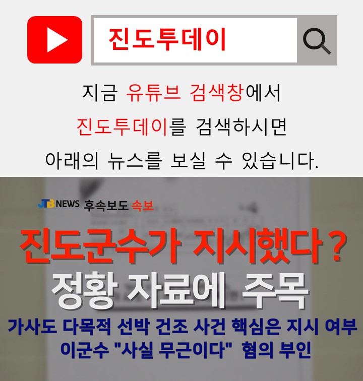 [JTB NEWS /진도투데이] [후속보도 속보] 진도군수가 지시했다? 정황 자료에 주목 가사도 다목적 선박 건조 사건 핵심은 지시 여부 이군수 “사실무근이다” 혐의 부인 ===========================================================