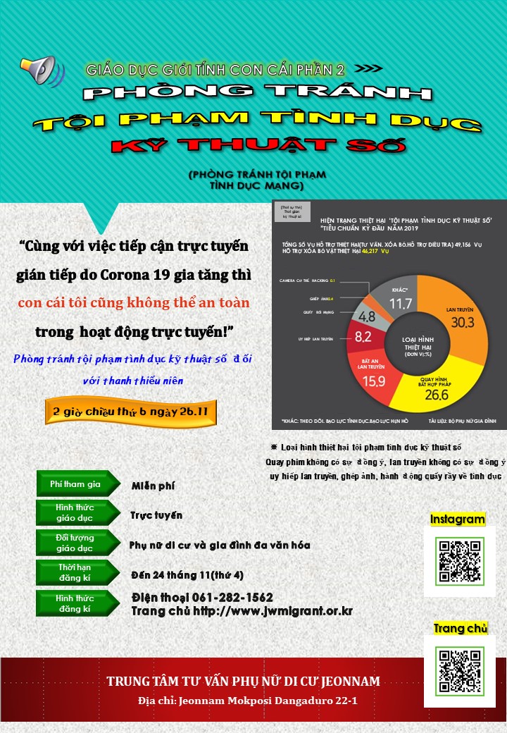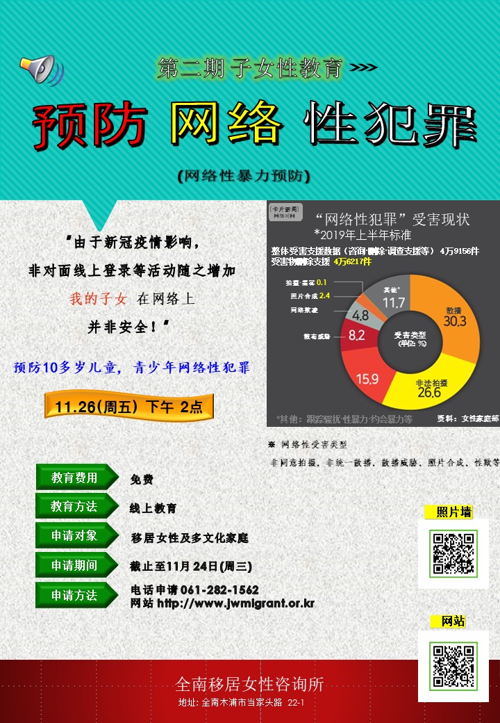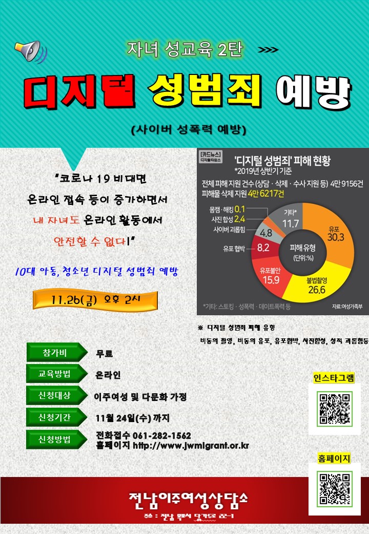이주여성 대상 11월 프로그램 안내 및 참여자 모집합니다. 관심있으신 분들의 많은 참여 부탁드립니다. 자세한 내용은 전남이주여성상담소 (061- 282-1562) 문의해주시기 바랍니다. ※ 사진을 클릭하면 더 자세히 볼 수 있습니다