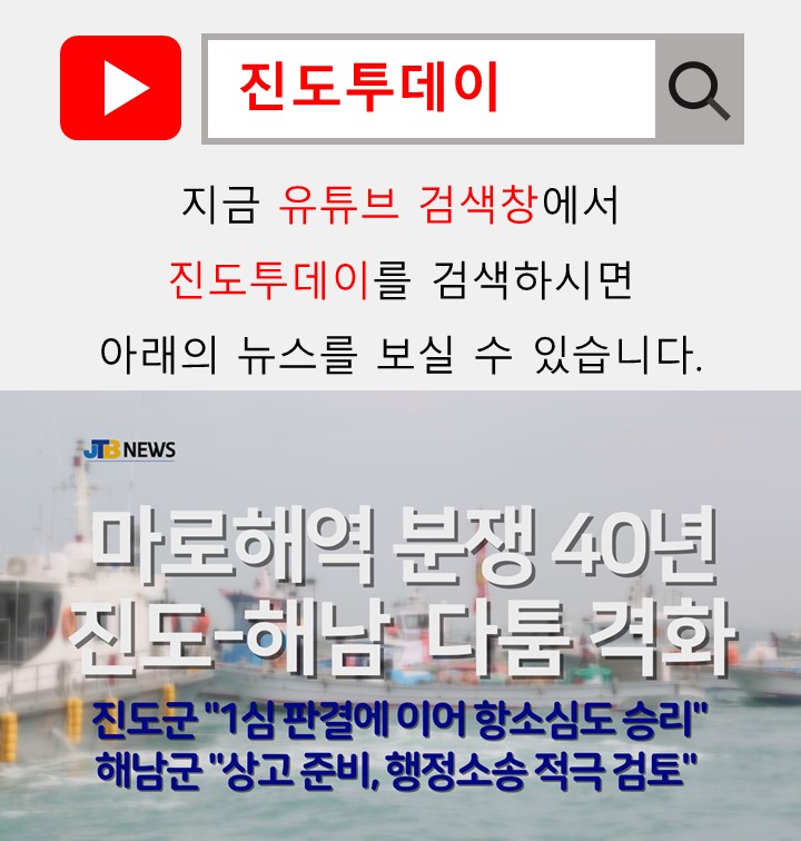 [JTB NEWS/진도투데이] 마로해역 분쟁 40년 진도-해남 다툼 격화 진도군 “1심 판결에 이어 항소심도 승리” 해남군 “상고 준비, 행정소송 적극 검토” ===========================================================