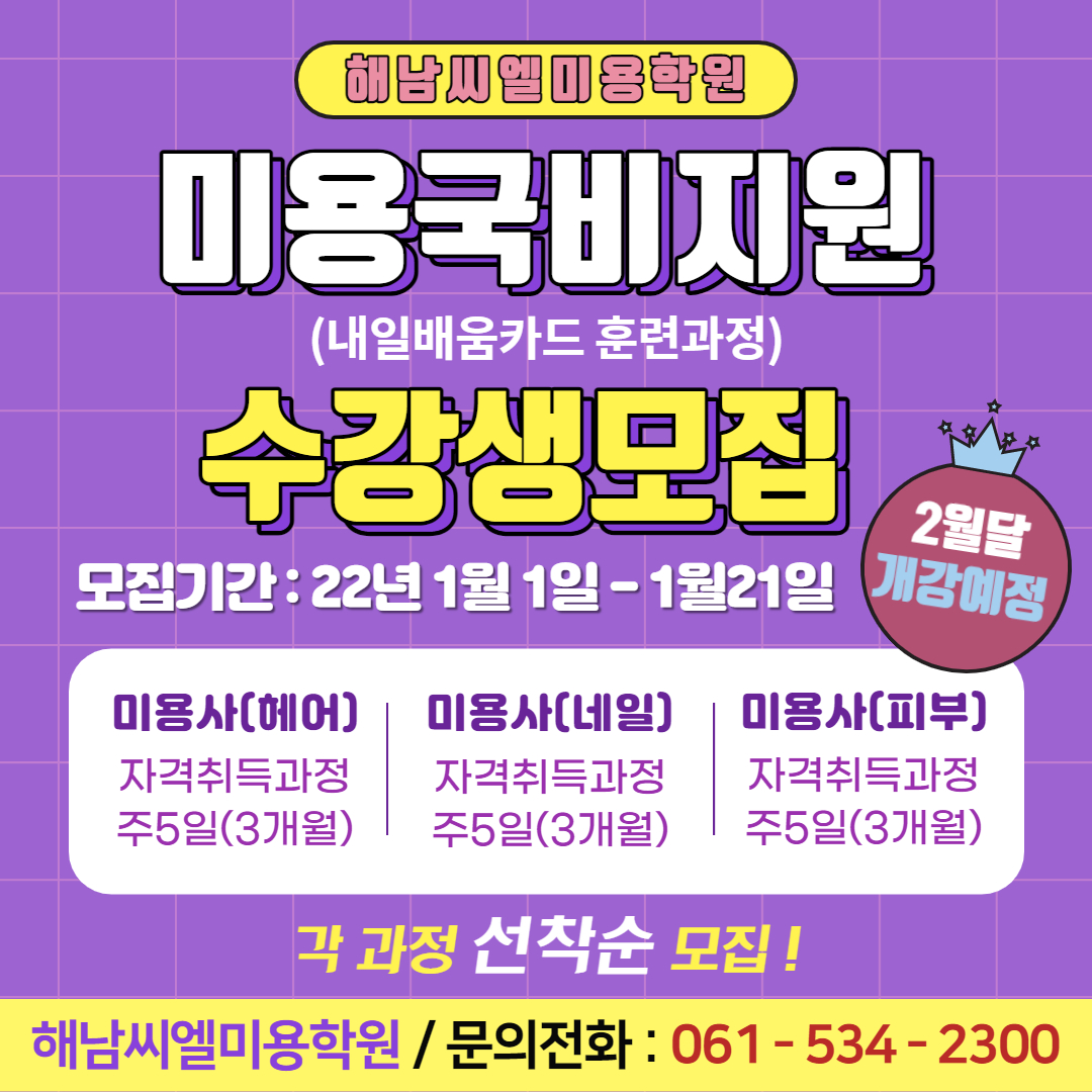 해남읍 구교리에 위치한 해남씨엘미용학원에서 미용국비지원 수강생을 모집합니다. 헤어자격취득반 네일자격취득반 피부자격취득반 모집기간은 22년1월1일 - 1월21일까지 입니다! 각 과정10명 선착순 모집! 자세한문의사항은 061-534-2300 으로 전화주세요!