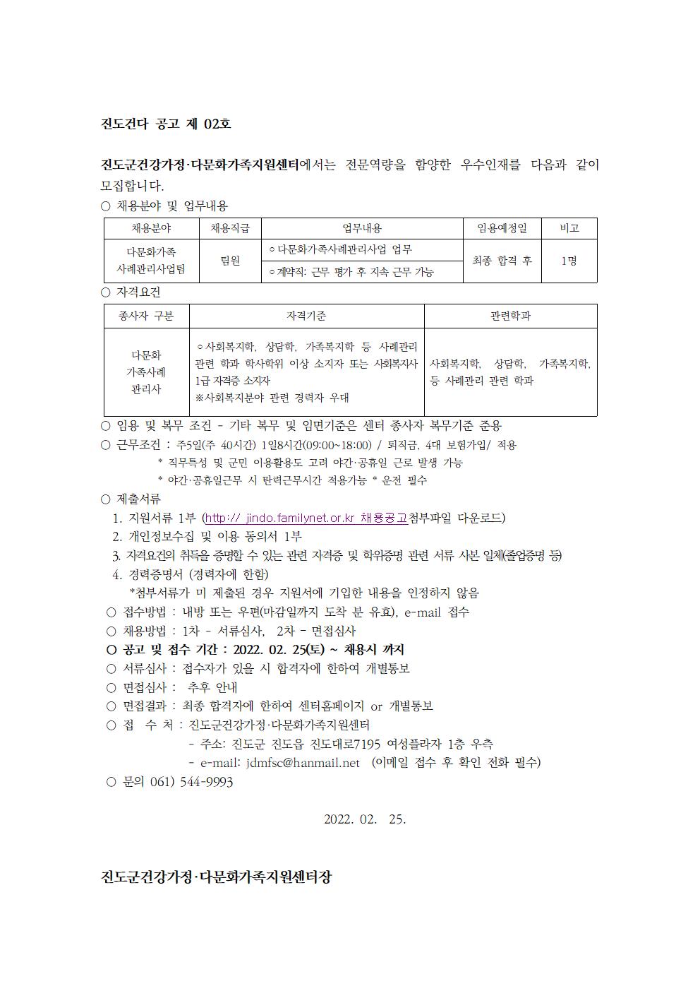 진도군건강가정다문화가족지원센터의 다문화가족사례관리사 채용 공고