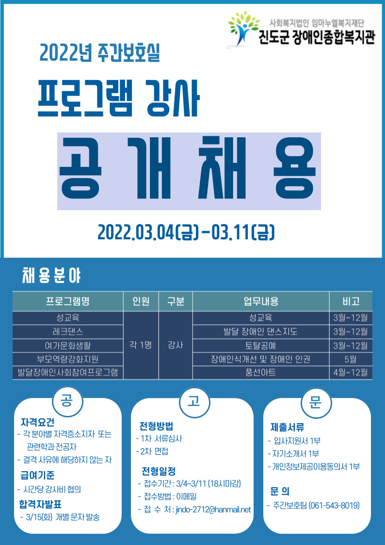 진도군장애인종합복지관 주간보호실 프로그램 강사 채용 공고