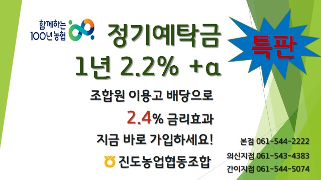 조합원 1천만원 예금 시 2.2%+∝ (이용고배당금 등)으로 2.4%의 금리효과!! 마감임박 서두르세요~~
