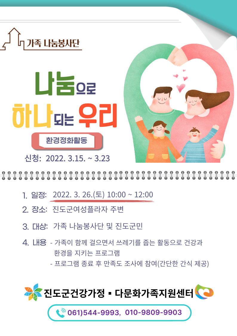 ♣가족센터♣ 3월 가족 나눔 봉사단 프로그램 참여자 모집