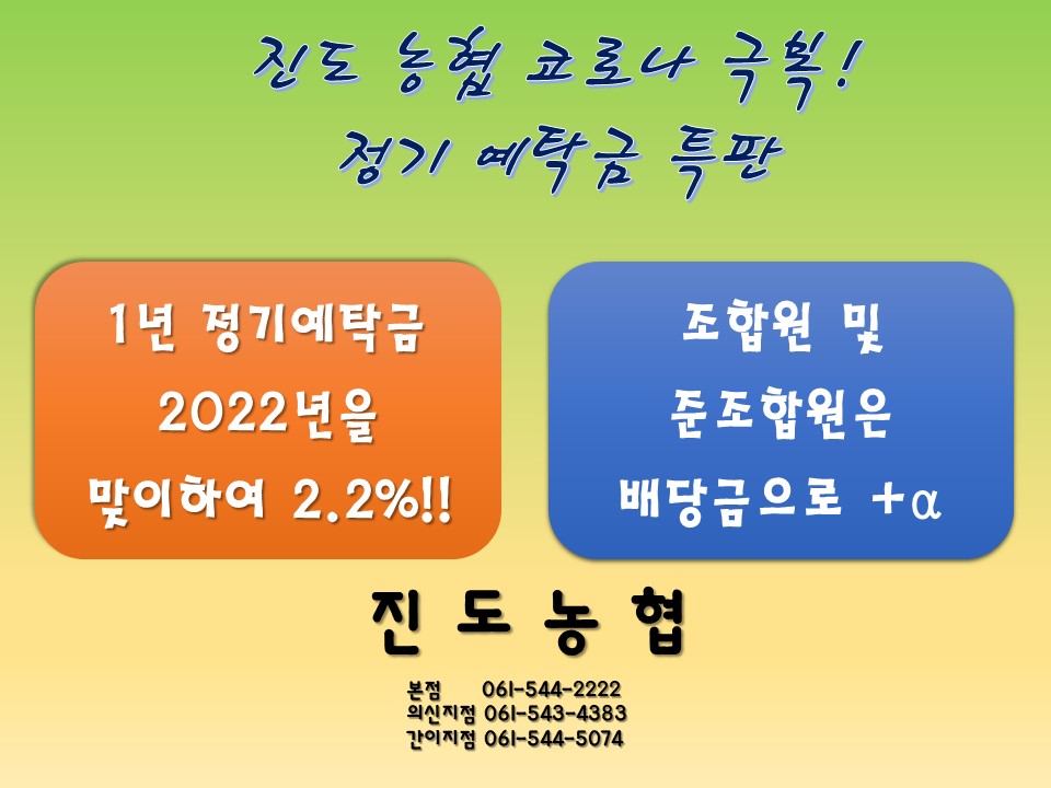 진도농협에서 코로나 위기 극복을 위한 정기예탁금 특판을 실시합니다. 1년 정기예탁금 2.2%에 조합원, 준조합원은 배당금으로 받는 +α까지 많은 가입 부탁드립니다.