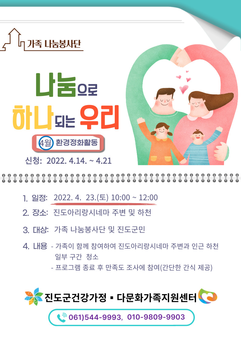 ♣가족센터♣ 4월 가족 나눔봉사단 - 나눔으로 하나되는 우리 참여자 모집