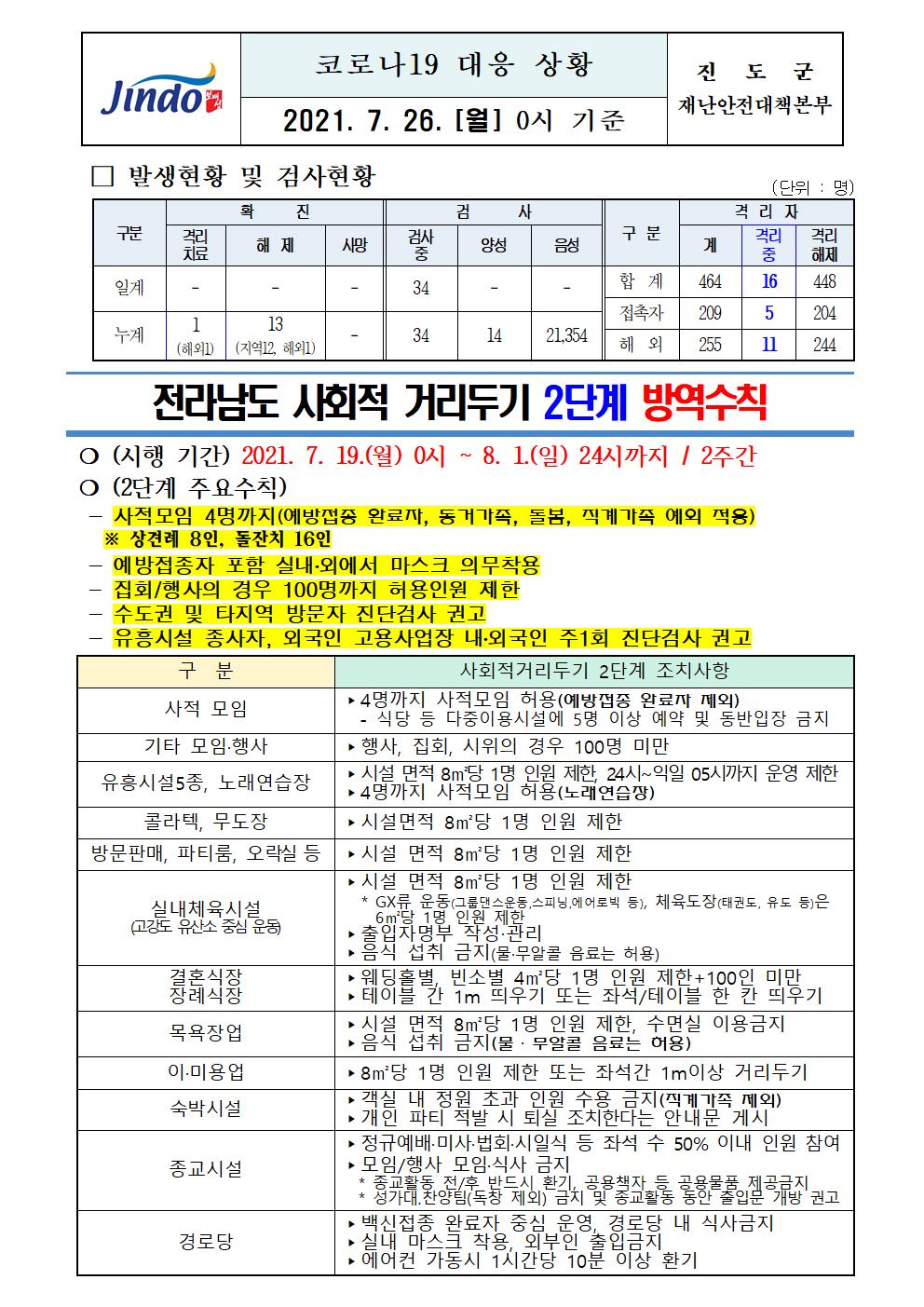 2021년 코로나 19 대응 일일상황보고(7월 26일 0시 기준)