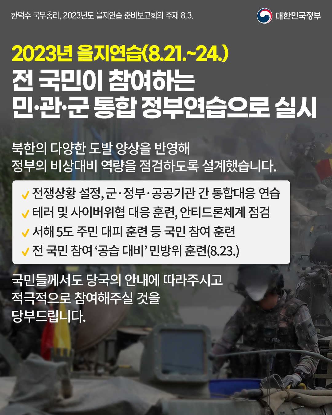 2023년 8월 21일부터 24일까지 진행하는 '2023년 을지연습'을