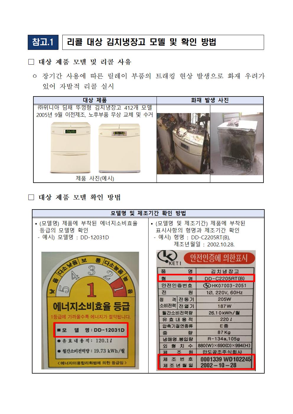 장기간 사용에 따른 릴레이 부품의 트래킹 현상 발생으로 화재 우려가 있어 위니아딤채에서 자발적 리콜을 실시합니다.