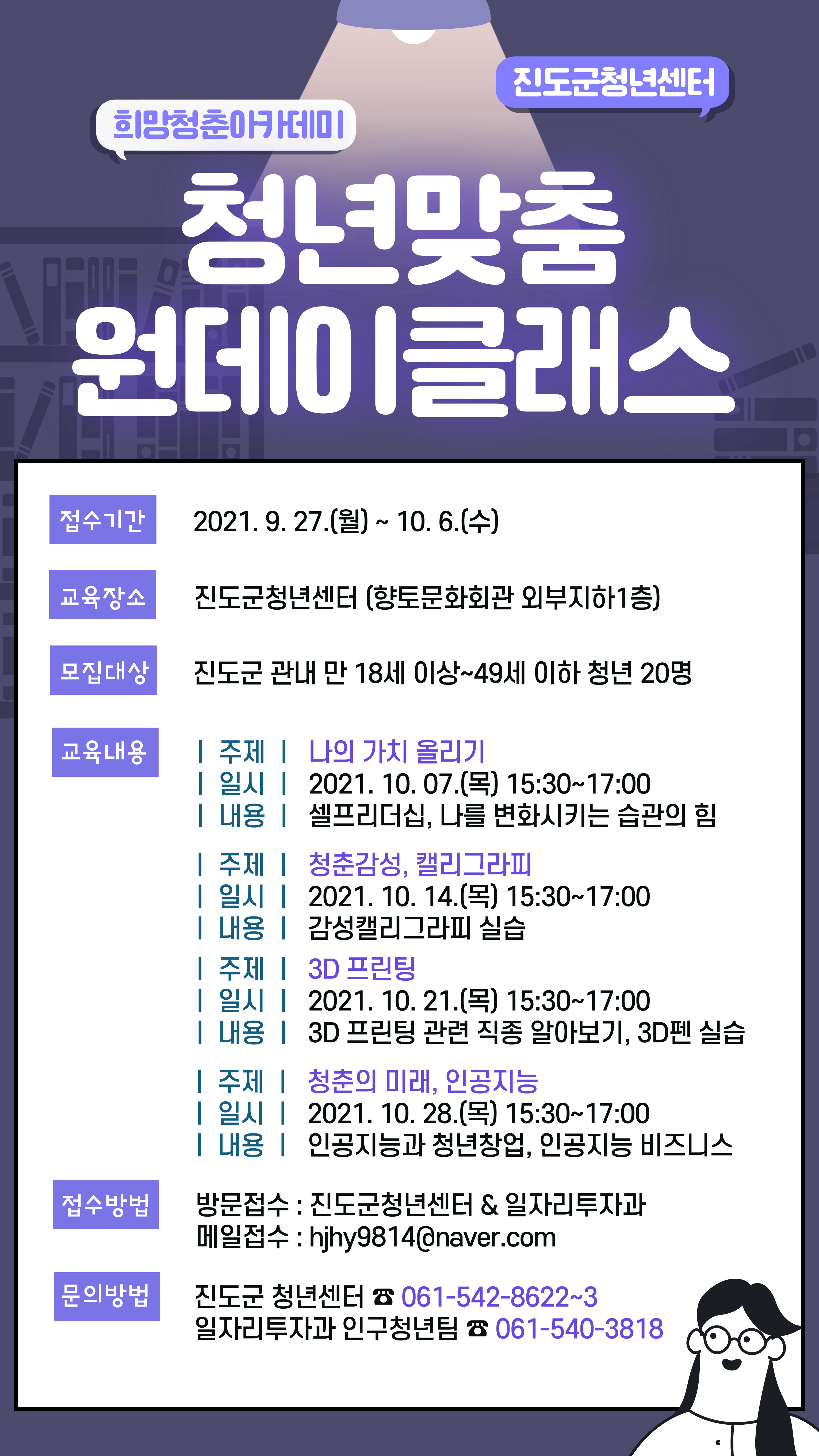 공지사항 10월 희망청춘아카데미 프로그램 안내 작성 청년센터 2021-10-01 15:30 조회 609 파일첨부 파일 2021년희망청춘아카데미공고문(10월).hwp (hwp,144KByte) 다운로드 이전글 2021년 진도군 청년 창업 스쿨(하반기) 수강생 모집 공고 다음글 (전라남도 코로나19 방역 동참 캠페인 )코로나19 생활속 방역하기 목록